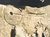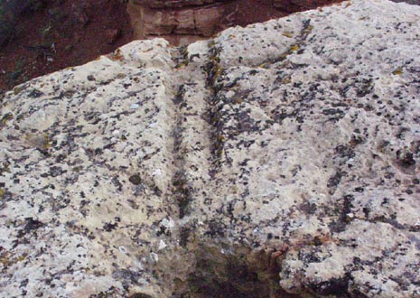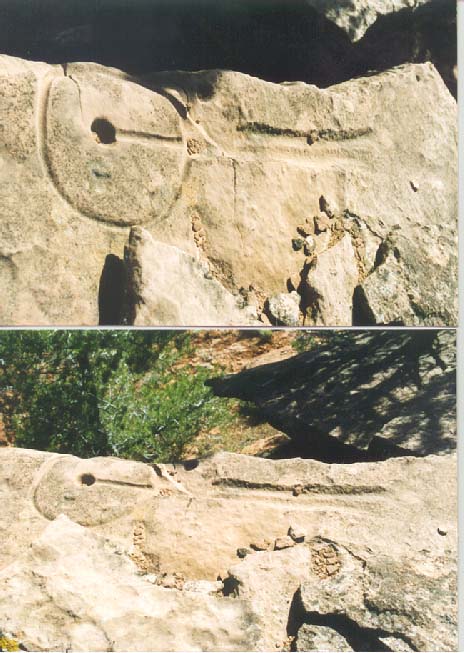 Other team members had already found examples of this fact. In patricular, where a glyph had fallen, and where it would have clearly been much easier to simply move the mark a few feet, the origional creator of the glyph had taken great pains to have the glyph "line up" with something and had literally "wraped" the circle portion of the glyph around the rock. Dave also speculated that the circle would most likely represent the user's field of view from that point (what we would today call horizon") and that the dot(s) might indicate the position/distance to an object in relation to the visible horizon. Oddly enough, this theory was later co-oborated by the Paleo-Hebraic theory.
